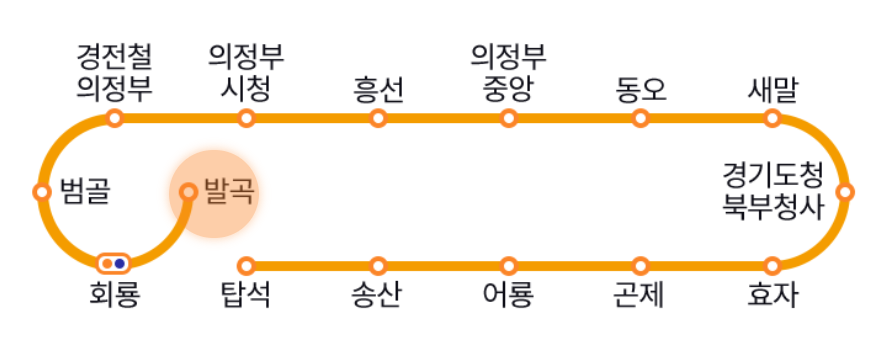 발곡↔회룡↔범골↔경전철의정부↔의정부시청↔흥선↔의정부중앙↔동오↔새말↔경기도청북부청사↔효자↔곤제↔어룡(용현산업단지)↔송산↔탑석