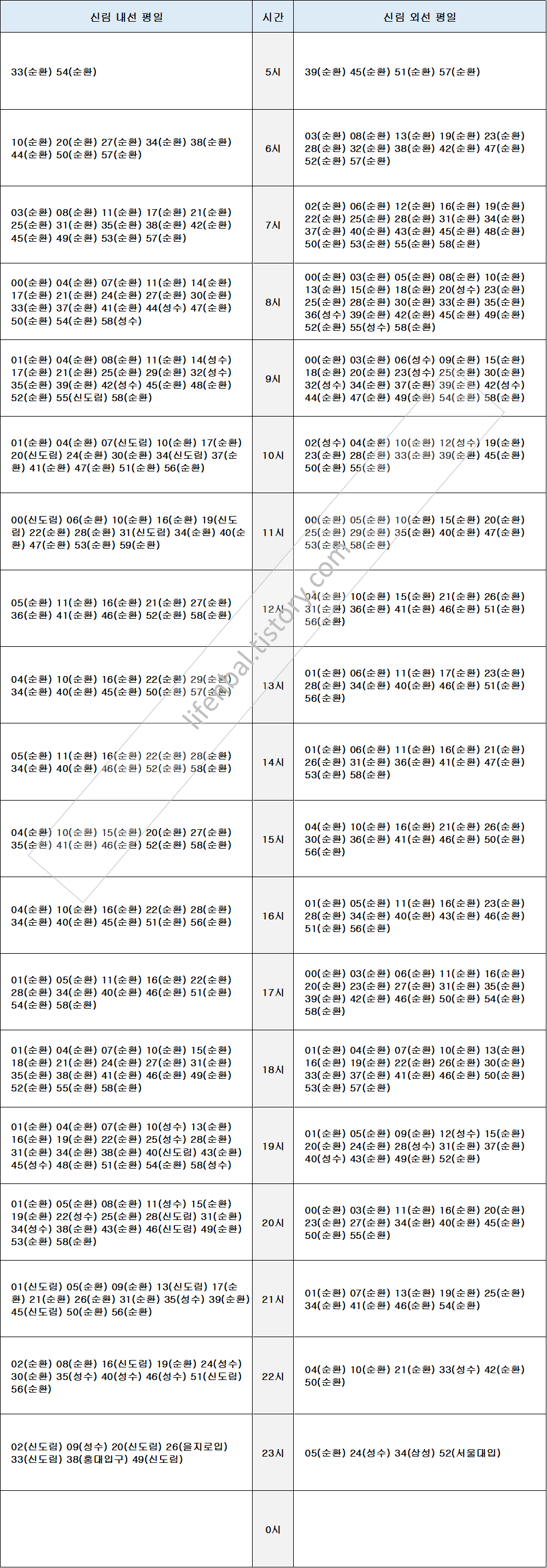 최신 지하철 2호선 신림역 일반 열차 열차 첫차 막차 정차역 시간표입니다.